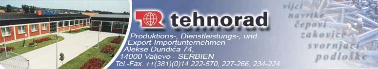 „TEHNORAD“ stellt heute 20 Arbeiter ein, die Schrauben (vijke, navrtke), Propfen (cepove), Metallbolzen (zakovice), Splintbolzen (svornjake) und alle anderen Teile außerhalb des Katalogs, nach der Bezeichnung oder nach dem Muster ausarbeiten.